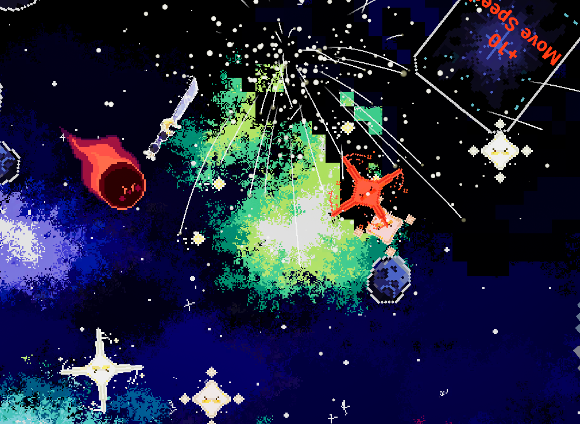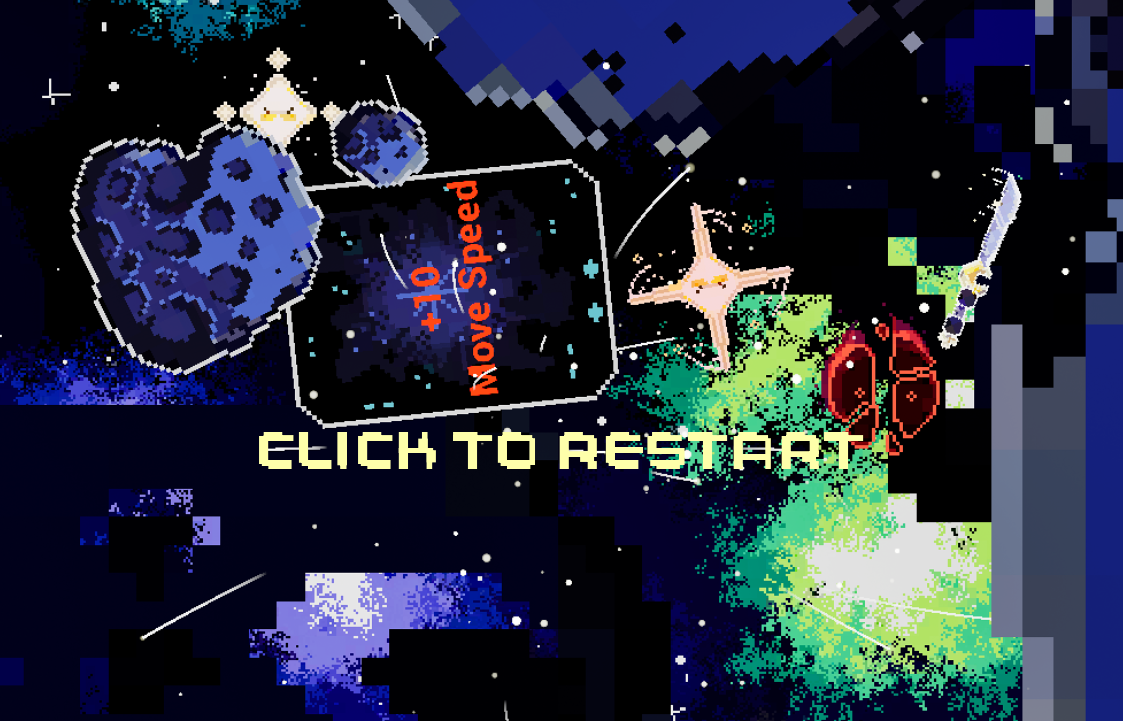 BUT, though many unique characters are drawn and ready to add to the game, there's not enough time in the game jam to include them. Nor enough time to fully realize the roguelike. So enjoy the arena! You will fight stars to earn stat boosts and achieve the best high score!